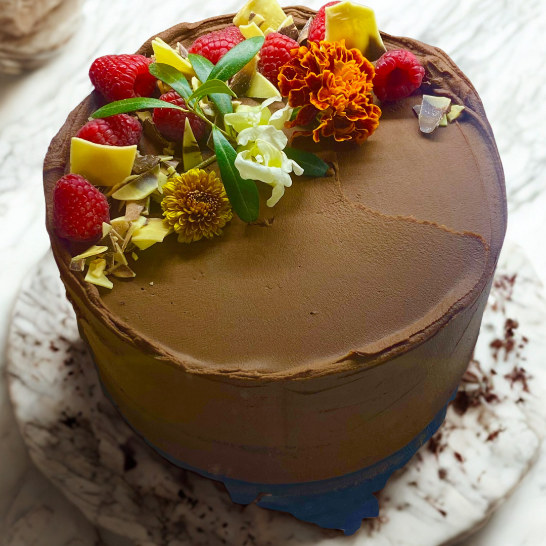 A rich, vegan dark chocolate cake layered with silky dark chocolate coconut frosting, elegantly topped with vibrant raspberry jam, fresh berries and seasonal edible flowers.