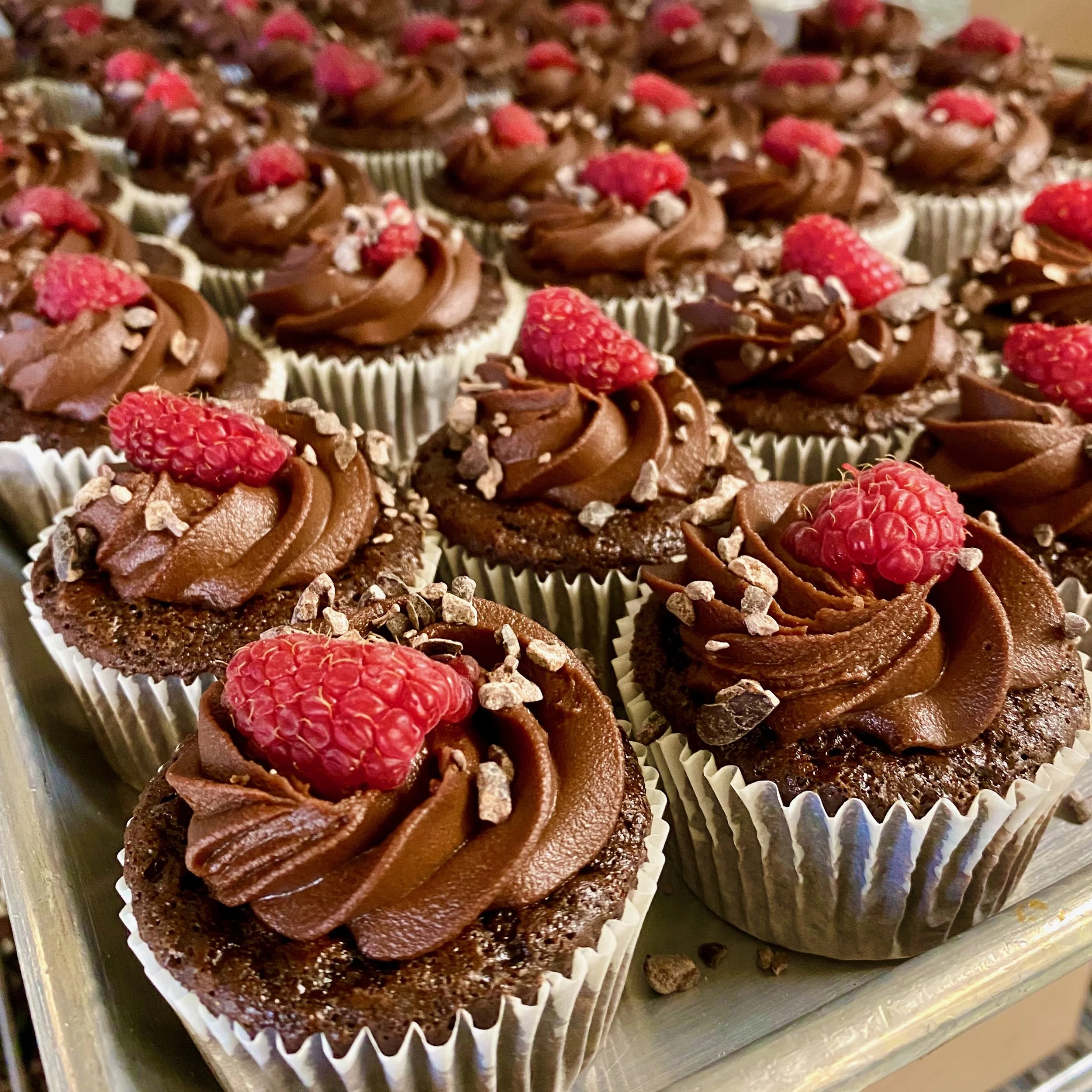 Rich chocolate cupcakes filled with house-made raspberry jam, topped with silky dark chocolate frosting, chocolate decoration and a fresh raspberry.