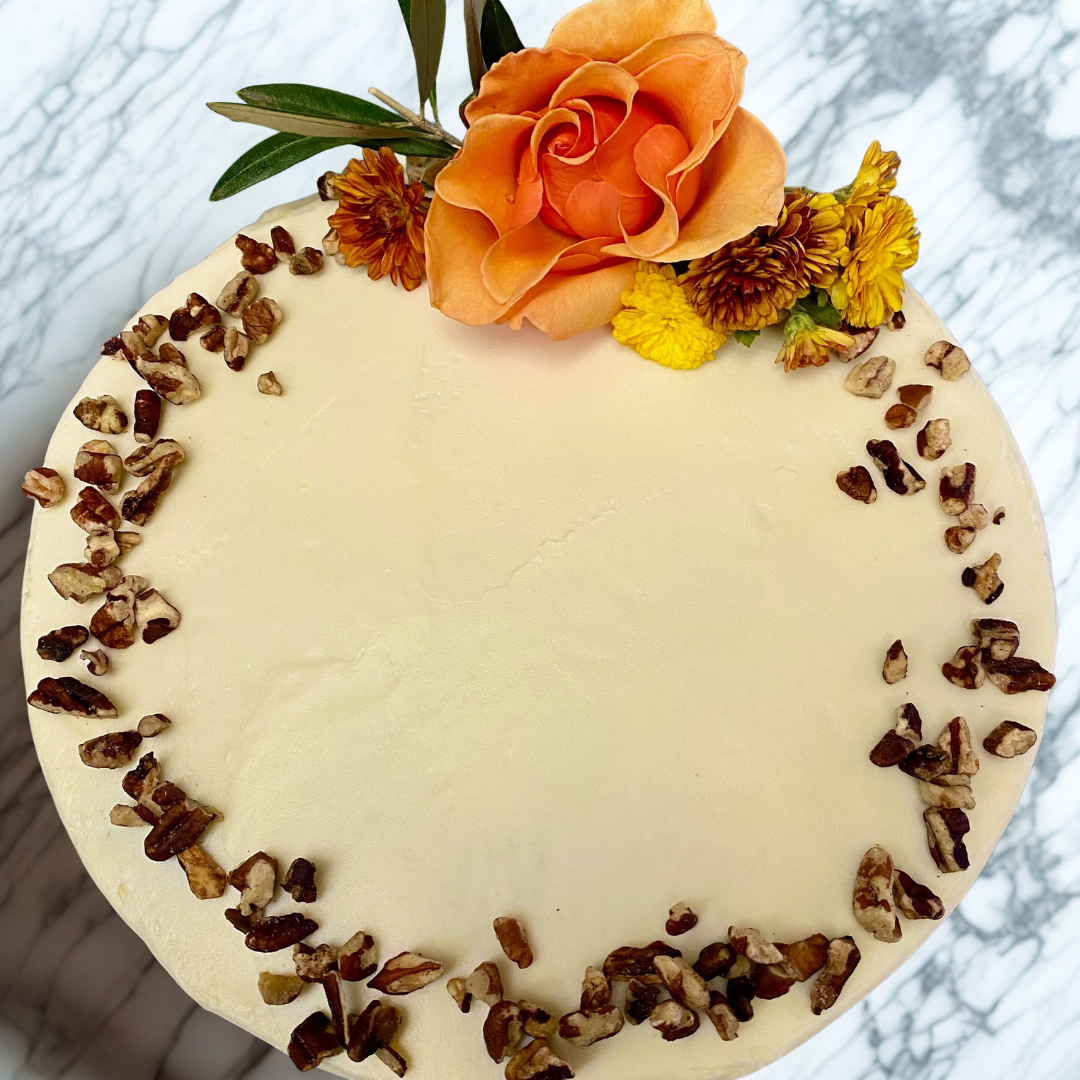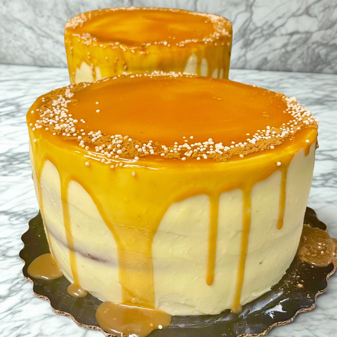 A moist yellow cake layered with cinnamon buttercream and house-made caramel. Frosted with cinnamon buttercream and topped with caramel, cooked apples and edible flowers. 3-layers of cake